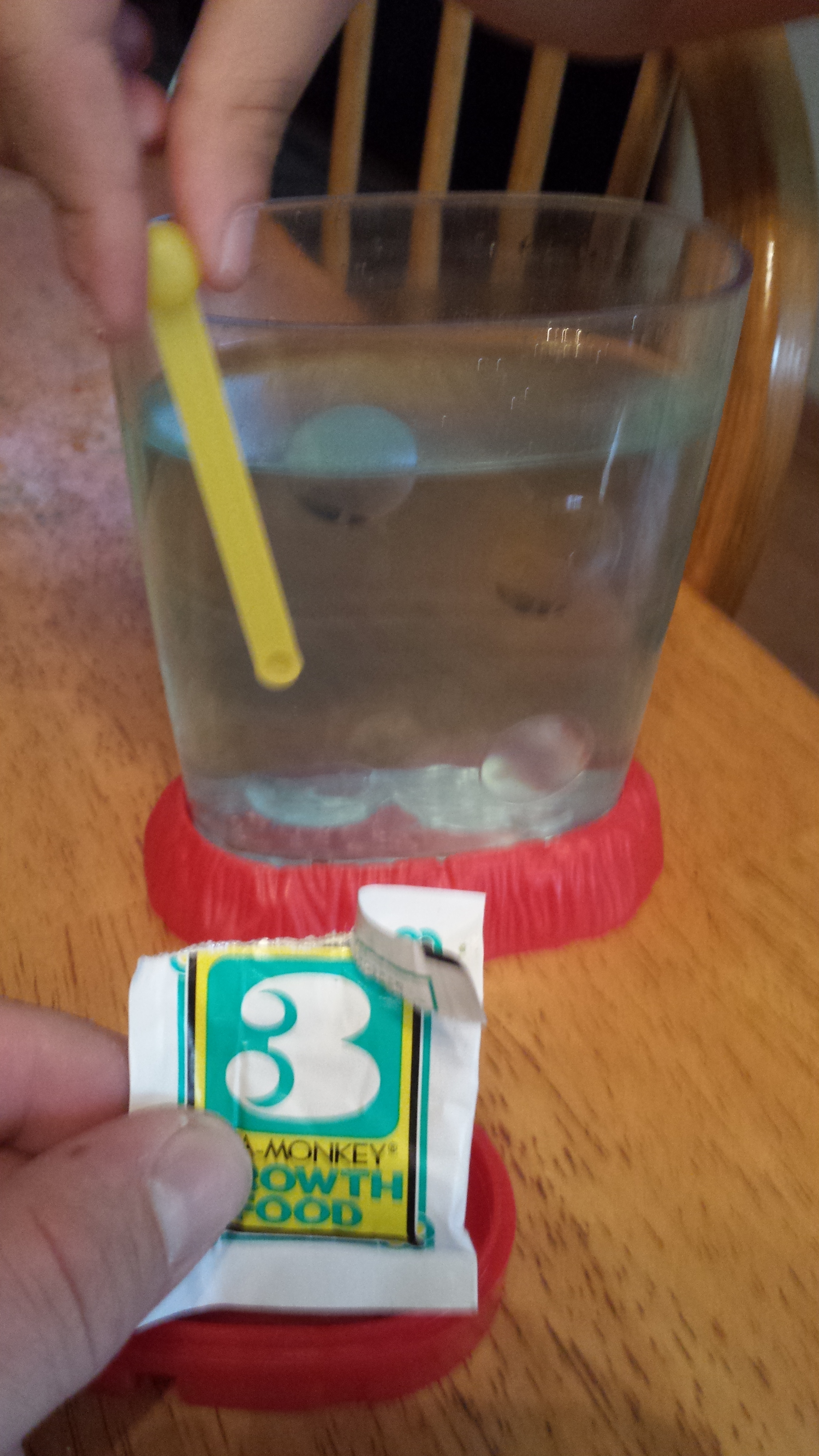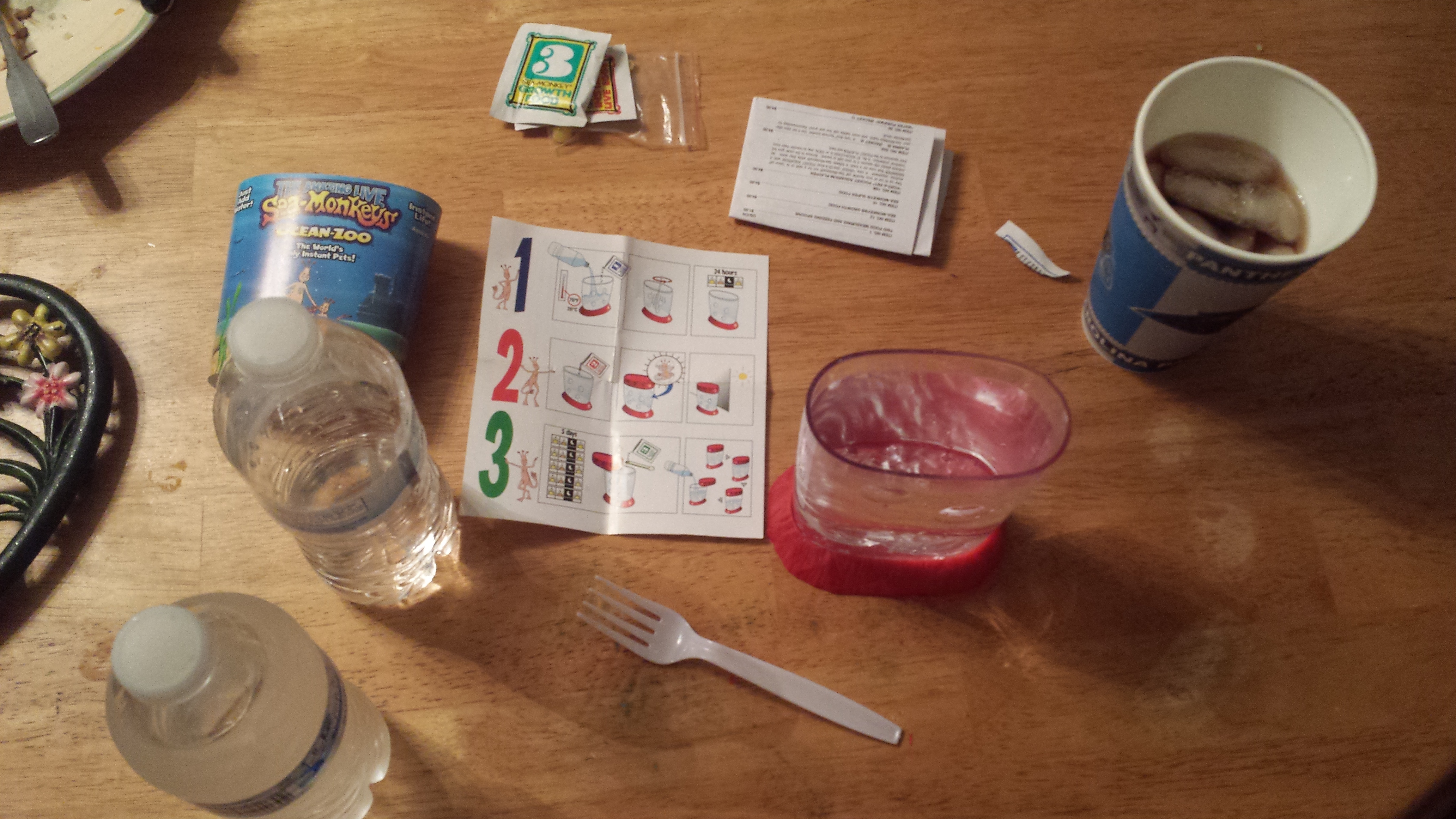 Holy crap! One lonely Monkey hatched! It’s nearly microscopic, but it is a creature that exists in this dimension! It just sulks around the tank and is very similar to the 1980’s non-GMO version of Sea Monkeys. It’s not a very exciting pet, but my kids seem to be thrilled that something finally happened inside the Tank of Sadness. I don’t have any pictures of the proto-Monkey because my camera has an irritating auto focus feature that is all about focusing on the table behind the tank.