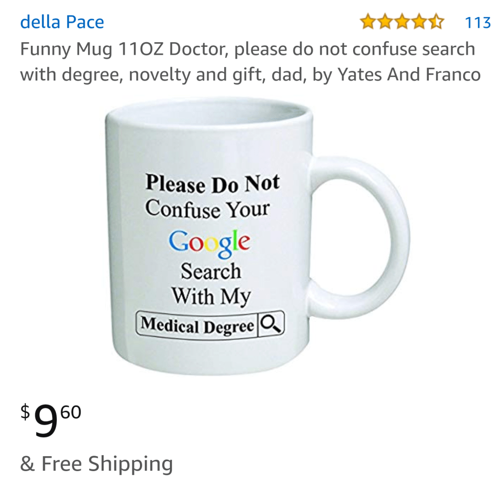 I can’t connect what a perverted search engine full of trash has to do with having a medical degree, even in the loosest idea of comedic senses. This is a very odd thing to print on the side of a nice little coffee mug, and almost feels like a this coffee mug was the result of a malfunctioning computer trying to tell a knock-knock joke, using only cats. I can do better than even better than that method: a drunk version of me could just as easily come up with even more bizarre (yet funnier) possibilities for a mug like this. Here’s a couple ideas I came up with off the top of my head while sorta drunk: