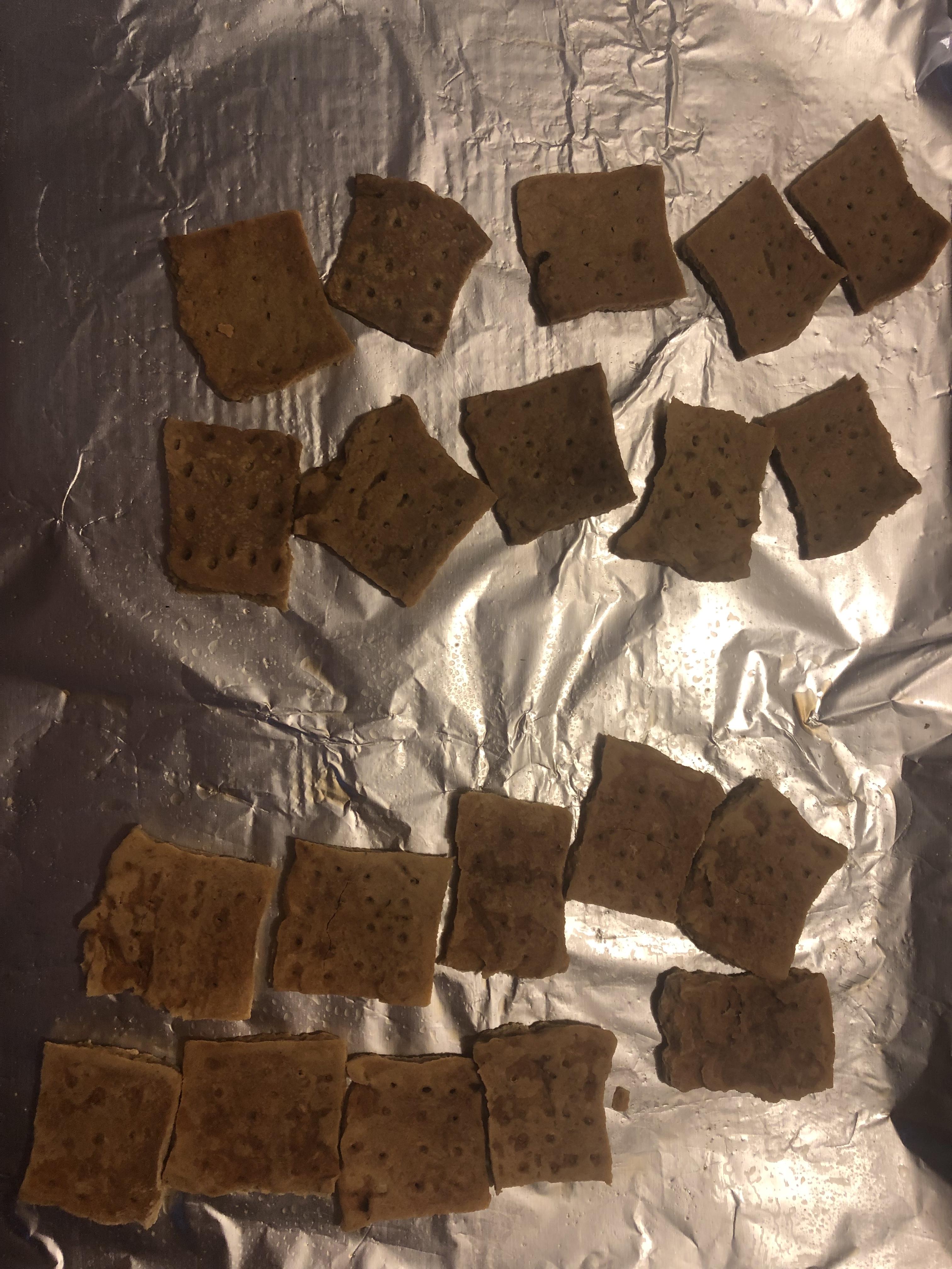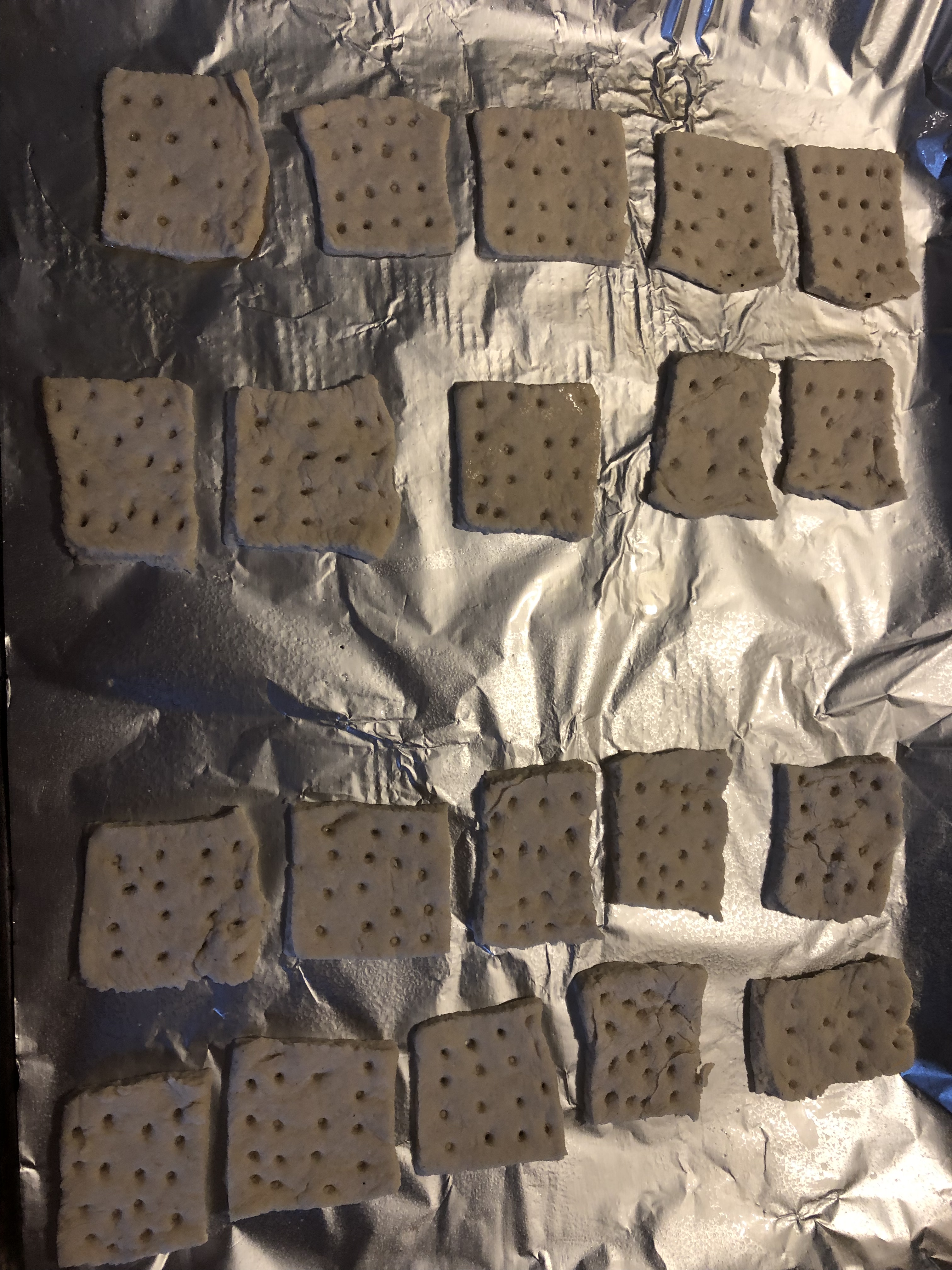 The signature to Hardtack are the 16 holes that each 3×3 square of dough is required to have. Using a dowel (I used the insertion end of a liquor bottle spout), the chef pokes the holes in the dough after making the squares. Apparently this is to keep the dough flat during the baking process, as the final product needed to be portable and as non-fluffy as possible. After all, if you’re going to die horribly of disease out in the wilderness of Virginia, it’s best to bring along a snack. Preheating my oven to proper Civil War baking temperatures (250 F) the cut and poked squares were laid on a greased baking sheet. I had a notion that the grease used might possibly make a difference, so I did half the pan in modern Pam spray, and the other half in bacon fat. After baking for 4 hours, yes…4 DAMN hours, the Hardtack was ready to cool and eat.