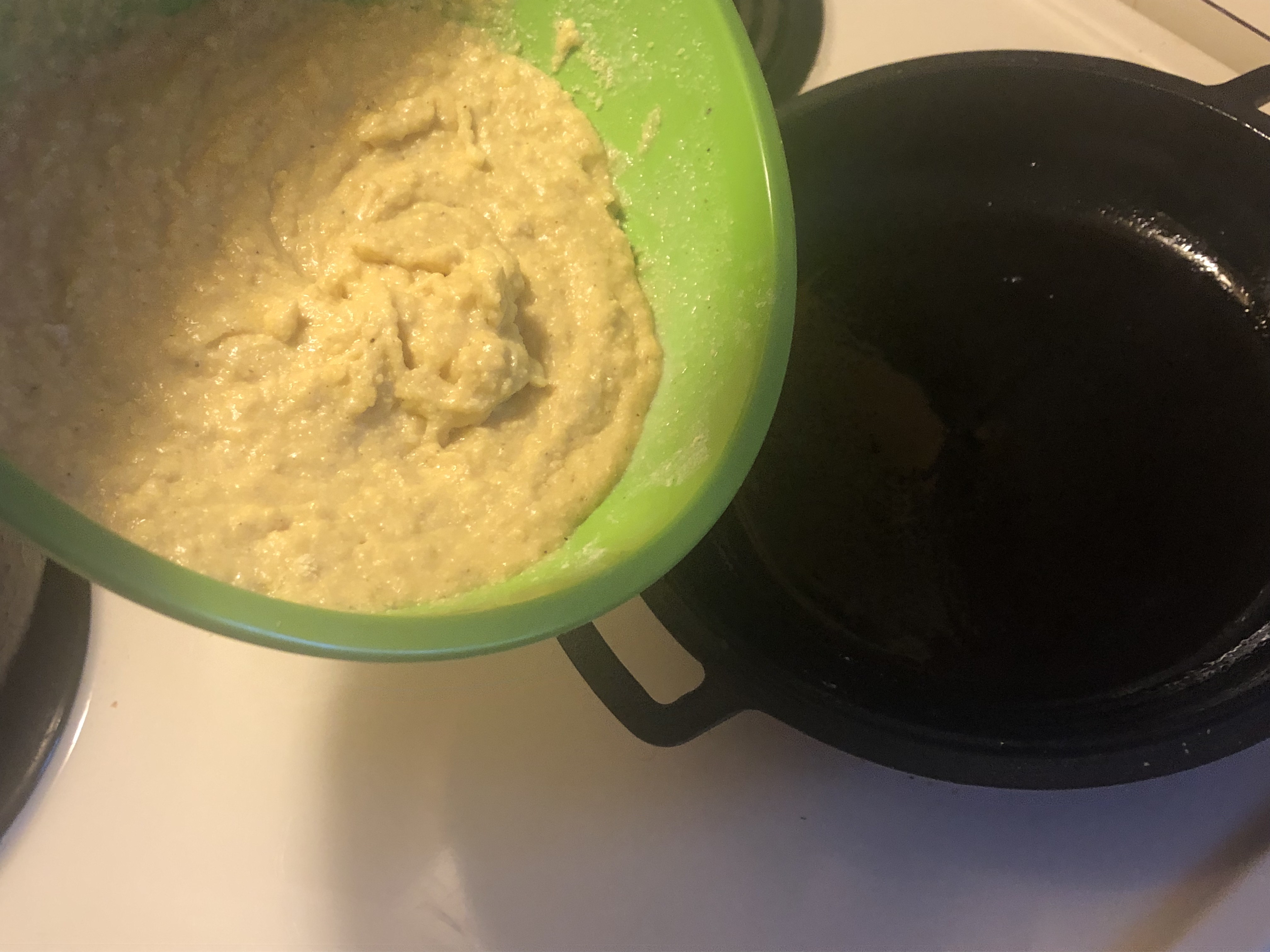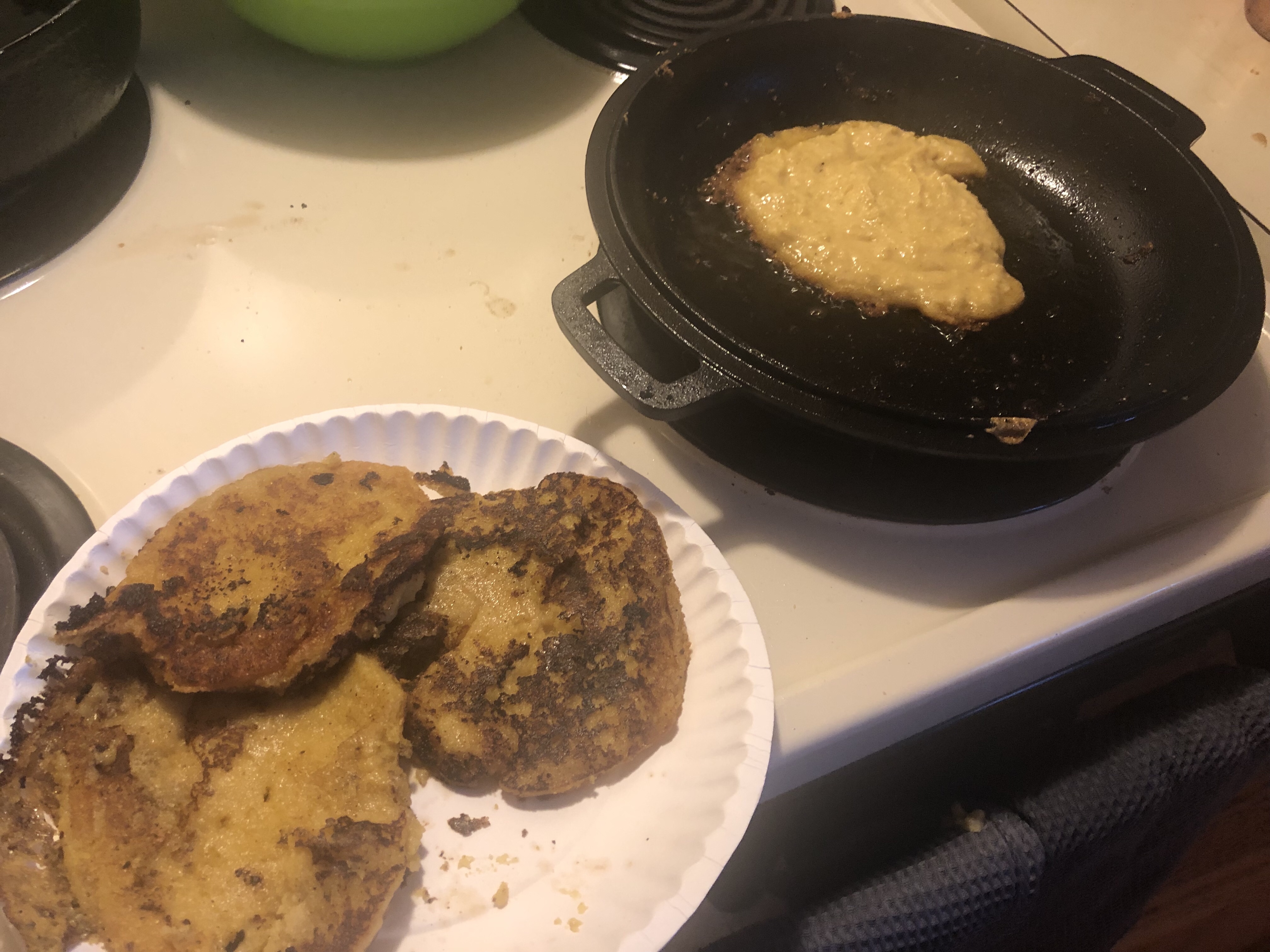 Johnny Cakes are thankfully slim on the ingredients: corn meal, salt, sugar, and boiling water. Mixing the components together to make a thick paste, my cast iron pan was greased with bacon fat and set on the stove to approximate a good strong 1862 flame temperature. Quick side note: I’ve purchased my own cast iron skillet/Dutch oven combo thing for all of these articles, as I’m sure my wife (not named Krisanthemum btw) would kill me otherwise for treating her cookware like this. I’ve never cooked anything with bacon grease before, so I have no idea what’s considered too little or too much. Spooning out the batter and making a fairly thick “cake” I notice that the mixture reallllly sucks up the bacon grease. The Civil War Chef would certainly have to employ a “grease boy” while I screw about with trying to flip the cakes, but as no such person was around I had to take matters into my own hands.