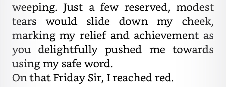 There’s a clear feeling of autobiography coming from the author. While not wholly exact to be sure, the emotion displayed by the Sub is one of pure grief that’s only quelled by the memory of just how hot and sexy the time with her Sir truly was. The erotica elements are intense and romantic, and in any other context would be a perfectly suitable piece of standard smut. There’s a plentiful feeling of fuzzy memories, but the dread is circling in the background that hits the reader with a final shot just before the brief story’s closing. The Sub is without direction and missing a piece of her soul after this relationship ends, but was it worth it to have the memories?