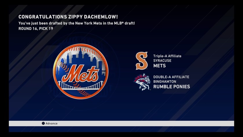Zippy wasn’t going to be fooled this go-round, now as a man who’s going to take his job seriously. The good name of the Binghamton Rumble Ponies wasn’t going to be squandered, and the future Big Apple Ace took to training in the new RTTS mini games. Beginning his career 5th in the AA rotation, Zippy has his work cut out for him facing the best of the Eastern League bats with some unique faces that we’ll be excited to challenge with the Friends/Rivals features of the mode. We’ll be playing this on dynamic difficulty, so as Zippy struggles, we’ll be able to commiserate and adjust right alongside him. There’s some that will say a beanpole with grade III rickets has no business taking part in professional baseball. To that we simply say…check the high inside corner, Zippy just changed your life with a backwards K.
