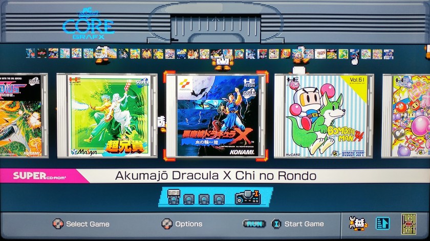 Once you have set up your video display preferences, all you have to do is scroll through the games until you find the one you want to play. There are 26 TurboGrafx games and 32 PC Engine games to pick from. The high amount of import games might sound daunting, but most of the PC Engine games are shooters or the original ports of American games like Bonk’s Adventure which don’t really need a lot of Japanese reading aptitude anyways. There’s even a Castlevania game in the PC Engine library: Dracula X Chi no Rondo, which is fucking sublime.