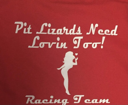 So as a young attractive woman in the pits (she is also “Miss Speedway” in her home state of Kentucky) gets branded as a pit lizard slut…gross. But why wear it with pride?