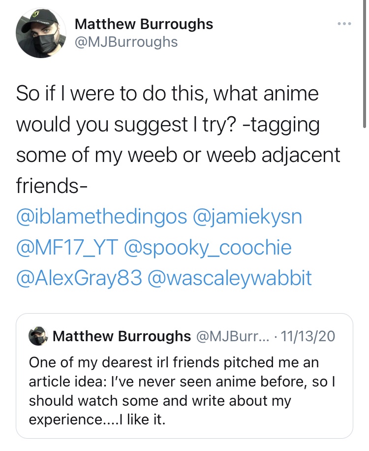 There’s no denying the cultural significance of the art form known as anime. An explanation on its history or impact (coming from me) would be rife with inaccuracies, so let’s just say that I’m very well aware of its influence. Save for some old Speed Racer cartoons that I saw with my dad over 25 years ago, my anime experience has been just about zero. With the world falling somehow further to hell and the coldest months creeping upon us once again, it figures it’s the best time to try something new that can be enjoyed indoors. After getting this article idea from my dear friend Shawn, I opened the question to Twitter to help me find the best anime to take in for my first exploration.