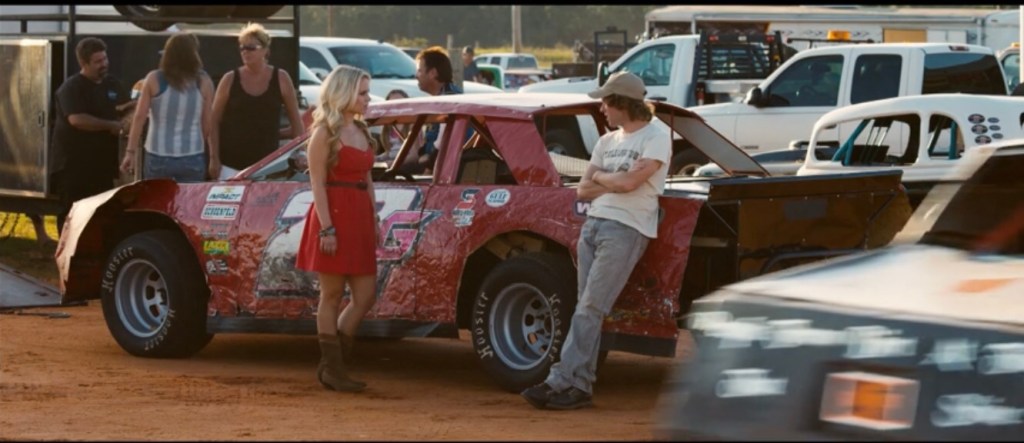 The racing in the film takes place sort of besides the story. Ty works for a pole business, (a telephone pole business more specifically), and is trying to balance the similarities and differences of that life to his existence on the track. Chasing sponsor money, pretty girls chasing him at the post-race hoedown concerts, living your best life while your once highly regarded father drinks himself to death in the home you were raised in…it’s all here and more. Street stock racing is the unquestioned cultural influence and main export of this small town, and the interpersonal relationships between the hero and villain driver revolve around qualifying for some sort of Alabama state championship race. The rich boy villains and the rich girl love triangles that come from this fit alongside most Hollywood scripts, but it just doesn’t have the same zip when it’s implemented in the street stock world. One might think it hard to trash talk in a “daddy’s money street stock”, but what’s on the screen is adorable and fairly realistic if you think about your own local dirt track in the same context, as sad as that may be.