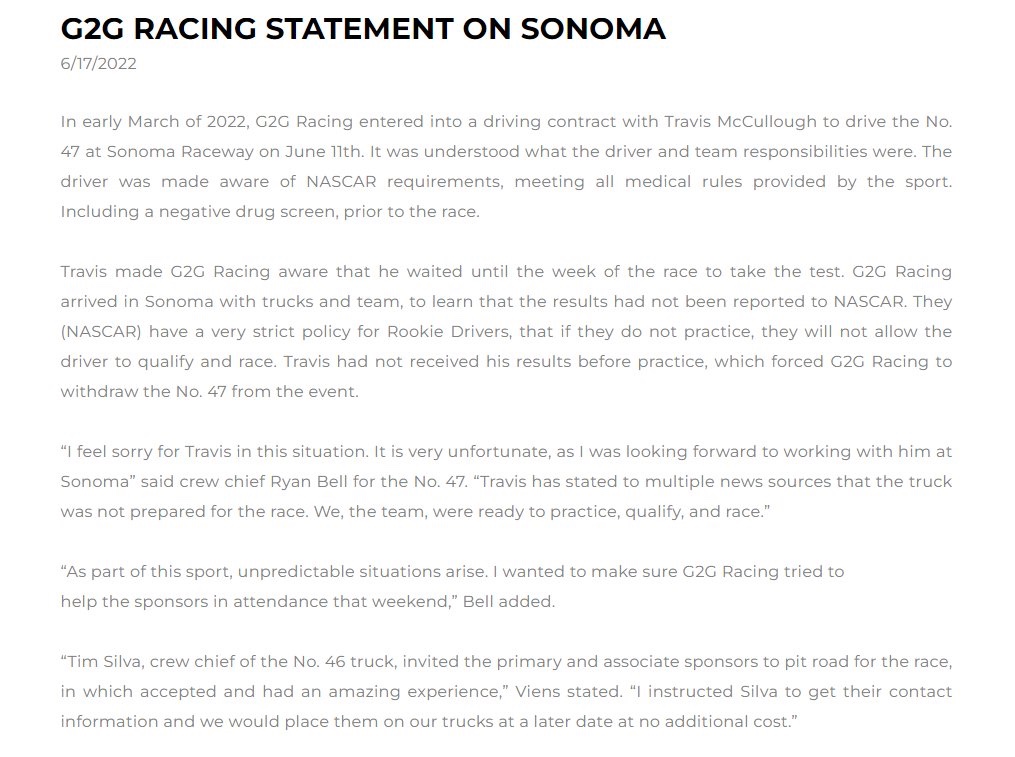 In short, from his account NASCAR looked at the 47 truck as it sat and informed McCullough that it was not ready to run through a technical inspection. “[G2G Racing] had sent two crew chiefs, two employees and a hauler driver total for these two trucks. My guys who have been in racing all their lives set out to get this truck ready. We worked for an hour [before practice] and maybe got it about 60% there when the crew chief told us that we had to stop working on the truck. I think this was because of the drug test.”